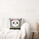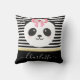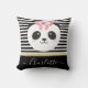 Beau ours de panda avec coussin en ruban rose. Ours de panda Kawaii aux joues roses, au ruban rose floral. Style tendance lignes noir et blanc rayé arrière - plan avec ruban doré. Customisez facilement et ajoutez votre nom pour personnaliser le coussin.