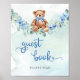 Les illustrations à l'aquarelle sont parfaites pour ajouter une touche fantaisiste à la décoration de tout événement. Un ours en peluche mignon entouré d'une couronne de eucalyptus, d'une balançoire et de fleurs bleu poussiéreux crée un design charmant et unique pour un panneau de table pour le livre d'or d'une baby shower pour garçon. Les couleurs douces et les détails complexes de l'art à l'aquarelle peuvent aider à créer une atmosphère douce et accueillante pour la célébration.