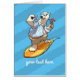 A greetings card featuring à ice cool polar bear enjoying a cold drink and a cooling hand fan while riding a bright yellow surf board. A chilled out design for the summer, which sits on a default bright background which can be changed before purchase if desired; the wave pattern will appear as a darker tone of your chosen background color. Change the default text to your preferred message or caption.