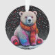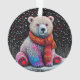 Ours polaire assis contre un arrière - plan sombre et étoilé. L'ours est rendu dans un motif coloré à la pointe qui lui donne un aspect ludique et fantaisiste. Il porte une écharpe orange vif qui ajoute de la chaleur à la scène. Le sol enneigé sous l'ours est également illustré d'une texture pointillée, et les étoiles et points colorés qui l'entourent créent une atmosphère festive et hivernale. L'ensemble est lumineux et gai, mêlant éléments de la nature et expression artistique.