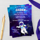 Make your child’s celebration truly out of this world with this vibrant space-themed birthday invitation! The design features a deep blue-purple galaxy background filled with stars, giving the perfect cosmic atmosphere for any little astronaut. A cheerful cartoon astronaut floats weightlessly near the bottom, adding a playful and adventurous touch kids love.