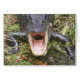 Un alligator nord-américain affamé, (Alligator mississippiensis), s'ouvre grand pour montrer ses hélicos aux visiteurs au refuge de marécages de Corkvis près de Naples, en Floride. STATUT : L'alligator nord-américain a presque été chassé à l'extinction dans la première partie du 20ème siècle. Les chasseurs les tuèrent pour leurs peaux, qui étaient utilisées pour fabriquer des ceintures, des sacs à main, des portefeuilles et des chaussures. Aujourd'hui, le gouvernement des États-Unis protège cet alligator, et pendant qu'ils sont encore chassés, toute chasse est contrôlée par un permis. Autrefois répertoriées comme espèce en voie de disparition, les populations d'alligators d'Amérique du Nord augmentent maintenant dans certaines régions. CARACTÉRISTIQUES PHYSIQUES : Les mâles adultes mesurent entre sept et 10 pieds de longueur, bien que des individus rares puissent atteindre jusqu'à 19 pieds. Les femelles sont beaucoup plus petites. Les yeux, les oreilles et les narines sont situés au-dessus de la tête, de sorte que l'alligator est capable de voir, d'entendre et de respirer alors qu'il est presque totalement immergé dans l'eau. Des adaptations spéciales dans la bouche de l’alligator lui permettent d’ouvrir ses mâchoires sous l’eau pour attraper des proies sans avoir à se déverser dans les poumons et peut-être se noyer. Ces alligators ont des pieds en toile, la peau entre les orteils, qui les aident dans l'eau. Mais en nageant, c’est la queue puissante qui se déplace à travers l’eau, les jambes servant de gouvernail. La queue musculaire est aussi une arme puissante de défense. HABITAT : L'alligator américain se trouve dans les eaux fraîches et légèrement salées des marais, marécages, rivières, lacs et canaux artificiels du sud-est des États-Unis, de l'est du Texas, de l'est à la Louisiane, du sud du Mississippi, de l'Alabama et de la Géorgie, et du nord aux régions côtières de la Caroline, et au sud à la pointe de la Floride. Leur nom vient des premiers explorateurs espagnols d'Amérique du Nord, qui les ont appelés "el lagarto", espagnol pour "le lézard". Les alligators nord-américains peuvent vivre jusqu'à 50 ans.
