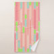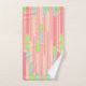 Ce kit de serviettes est d'inspiration art déco et est composé de longs ovales remplis de couleur ou de lignes en rose, vert et bleu.