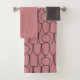 Cet ensemble de serviettes a un design art déco d'ovales roses, rectangles et cercles en lignes horizontales grises qui se répètent en rangs.