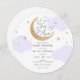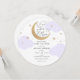 Baby Shower invitation featuring watercolor purple clouds and stars with gold glittery moon and fun script "We are over the moon!" Personalize with your information or click "click to customize further" to adjust font type, size, color.