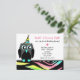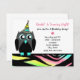 Un invitation de fête d'anniversaire illustrant un hibou noir et gris avec des griffes bleues et un bec à gauche. Owl porte une empreinte zébrée avec un casquette de la fête néon correspondant à la bordure en bas. Personnalisez le texte rose et noir avec les détails de votre occasion.