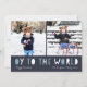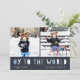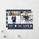 Whimsical Hanoukka carte photo présente deux de vos photos de famille préférées dans un format carré aligné côte à côte. "Oy to the World" apparaît sous les lettres découpées bleues et blanches. Personnalisez avec votre nom de famille ou vos noms, des salutations personnalisées et l'année le long du bas. Les cartes retournent à un motif de neige blanche sur des bandes bleues. Une carte Hanoukka amusante et moderne conçue pour ajouter une joie légère à vos mailings de vacances.
