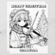 Page de coloriage à thème Noël pour les enfants. Jolie fille de dessin animé festive jouant de l'alto devant un sapin de Noël décoré.