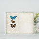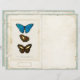 Page vintage du journal des pourriels avec illustration scientifique du papillon bleu et marron sur le devant et illustration du papillon brun sur le dos. Dessins et annotations français. Pages turquoises d'arrière - plan cachemire et de parchemin avec étiquettes d'or, ruban et détails de couture dans le centre. Plier en deux pour créer des pages de journal.