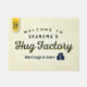 Encouragez les visiteurs à votre maison avec cette conception unique de typographie comportant le message, "accueil à l'usine de l'étreinte de la grand-maman. Les meilleures étreintes en ville." Comporte également des personnes étreignant l'icône à côté du tagline. La conception apparaît à la marine, et à l'arrière-plan de jaune et jaune-clair. La bannière dans le coin gauche supérieur inclut l'expression, "ouvrent 24 heures."