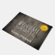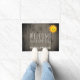 Pays mignon rustique, natte bienvenue personnalisée parfaite pour un cabine dans les bois vieux, arrière - plan grayed et rustique en bois de grange. Nom de famille personnalisé au fond dans les lettres blanches et élégantes. Lit, "accueillez à notre endroit heureux" dans les lettres rustiques au milieu. Un soleil de kawaii dans le coin supérieur sourit aux visiteurs. Accueil rustique, d'amusement pour la famille et amis. Style rustique de pays, cadeau décoré d'un monogramme de pendaison de crémaillère pour la famille ou cadeau unique de wedding shower pour les nouveaux mariés. Note : Toutes les images sont imprimées. Bois non réel. Nous avons des nattes bienvenues plus rustiques de sorts dans notre magasin en ligne de Zazzle.com/angela65.