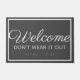 Offrez un accueil chaleureux et amusant à vos invités avec ce design personnalisé de tapis d'accueil. Design a l'air d'un simple tapis d'accueil jusqu'à lire attentivement qu'il décourage les clients de surpasser leur visite. Les mots lisent "bienvenue ne l'usez pas" avec le nom de famille et est. date ci-dessous. Le design est composé de calligraphie grise et blanche et de lettrage moderne sur un arrière - plan gris. Une bordure blanche enferme les lettres sur le tapis. Conception par © Ms_Jade. Magasinez d'autres créations amusantes dans ma boutique Zazzle à l'adresse www.zazzle.com/Ms_Jade*