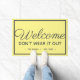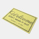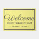 Offrez un accueil chaleureux et amusant à vos invités avec ce design personnalisé de tapis d'accueil. Design a l'air d'un simple tapis d'accueil jusqu'à lire attentivement qu'il décourage les clients de surpasser leur visite. Les mots lisent "bienvenue ne l'usez pas" avec le nom de famille et est. date ci-dessous. Le design présente une calligraphie gris foncé et du lettrage moderne sur un arrière - plan jaune. Une bordure blanche enferme les lettres sur le tapis. Conception par © Ms_Jade. Magasinez d'autres créations amusantes dans ma boutique Zazzle à l'adresse www.zazzle.com/Ms_Jade*