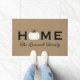 Bienvenue dans votre maison cet automne avec un tapis de portes personnalisé. La conception de typographie simple et élégante comprend le libellé "Home" avec un texte de script personnalisé élégant pour votre nom de famille et un accent citrouille de récolte blanche. Comprend un teint neutre, tan, noir, blanc et vert.