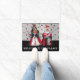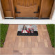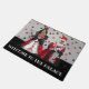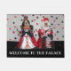 Ce tapis de porte comporte les chiens d'arrêt d'or habillés en tant que le roi et reine des coeurs. Le texte lit, "accueillez au palais".