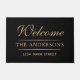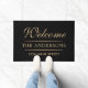 Tapis de porte moderne et élégant. Ce Design comporte un texte bronzé "Welcome" en écriture de script de calligraphie avec le nom de famille, l'adresse de rue de votre maison et des accents de ligne de séparation horizontale simple.