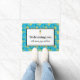 Le tapis de porte est affiché en bleu ciel et bordé d'ananas avec bordure noire intérieure et texte sur arrière - plan blanc. Texte : "Vous accueillir avec paix, joie et amour". Possède une seule icône d'ananas près du haut. L'ananas symbolisait l'hospitalité. Customisez ce tapis ou achetez tel quel.
