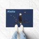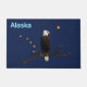 Un aigle à tête blanche scanne le ciel de sa perche sur une branche d'arbre; superposé sur un drapeau de l'Alaska. Lecture de texte, "Alaska" apparaît en bleu et blanc brillant.