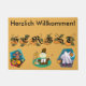 Ok, je sais que les illustrations se penchent vers la culture américaine, mais qui n'aime pas un pèlerin centralement localisé dans l'amitié avec une dinde et écartant ses bras s'ouvrent pour faire bon accueil à la récolte (ce "Herbst" en allemand) et à a tour-ou-treater ? Après tout, Halloween a écarté de plus en plus en Allemagne. Ce tapis est dirigé avec l'accueil standard en allemand, "Herzlich Willkommen !" Laisser décoratif dans "Herbst" est de façon saisonnière approprié et réminiscent du lettrage de "Fraktur" d'Allemand. Je mettrai le tapis à la porte à ma salle de classe, et vous pouvez, aussi.