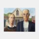 C'est le tableau classique de Grant Wood, American Gothic, montrant un fermier et sa femme debout devant leur ferme, lui avec sa fourche, son regard sur lui.