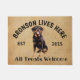 Porte d'accueil Amoureux des chiens personnalisé Rottweiler. Ce tapis de bienvenue peut être personnalisé avec le nom de votre chien, le slogan peut aussi être changé ou vous pouvez utiliser une photo de votre propre chien (assurez-vous qu’elle est transparente). Texte : Bronson vit ici... Tous les traitements sont les bienvenus Modifier le design pour changer la police, les couleurs et la couleur arrière - plan. Fait un cadeau merveilleux pour une fête de ménage, vacances, amoureux de les chiens et la plupart de toutes les occasions.