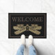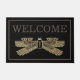 Ce tapis d'entrée hiéroglyphique d'art égyptien ancien personnalisé ou tapis extérieur présente une image d'un scarabée ailé au centre du tapis. Les ailes du scarabée couvrent la plus grande partie de la largeur. L'effet brillant dans la couleur or lui donne une parties scintillant d'apparence. L'expression simple "Bienvenue" est imprimée au-dessus de l'image dans une couleur brun chaleureuse. Un cadre marron assorti borde le tapis.