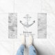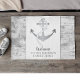 Un matelas de bienvenue d'apparence naturelle avec un thème nautique avec une ancre argentée et un arrière - plan en bois gris clair. Il s'agit d'un grand tapis de bienvenue pour votre bateau, voilier, chalet ou maison. Personnalisez le nom de famille pour en faire un moyen d'accueillir vos invités.