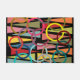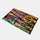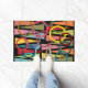 Ce tapis de portes a un design moderne du milieu du siècle de triangles et anneaux dans les couleurs rétro sur un champ de noir.