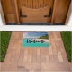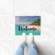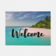 Welcome doormat with a beautiful photograph. A scenic tropical beach with aquamarine water and a white sandy beach with a lush forest in the back.