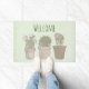 Tapis de porte d'accueil au design fantaisiste. 3 cactus mignons tous dans une rangée avec des visages souriants assis dans un pot à fleurs chacun portant des bijoux.