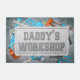 Ce tapis de portes est parfait pour le père qui aime bricoler dans son atelier ou sa mancave. Il a un design industriel masculin avec du ciment en détresse avec un arrière - plan en tôle métallique entouré d'outils comme une clé, scie, ruban de mesure, marteau et texte "Daddy's Workshop". Le cadeau parfait pour papa en Fête des pères ou pour son anniversaire.
