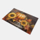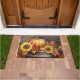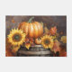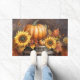 Une belle porte de couleurs automne ou automne ou temps de récolte. Citrouilles, tournesols et chute du feuillage sur un tonneau avec des papillons. Vraiment joli !