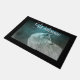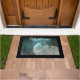 Un tapis de bienvenue avec une photo d'un magnifique loup gris et velouté. Dans l'arrière - plan est une forêt sombre avec des arbres. Vibe mystique magique.