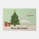 Illustration originale de Destei d'un mignon berger suisse blanc / chien de race berger allemand de couleur blanche. Le chien est debout près d'un sapin de Noël festif orné d'ornements rouges et jaunes, d'une guirlande de perles blanches et d'une étoile jaune posée sur le sommet de l'arbre. Il y a aussi deux cadeaux emballés par l'arbre et derrière le chien il y a une étagère marron avec deux bougies. Le sol est beige et la couleur arrière - plan est vert clair. Il y a aussi une zone de texte personnalisable qui se lit maintenant : "Joyeux Noël !".