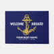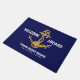 Faites une déclaration avec ce tapis de porte bleu et or de la marine nautique élégant! Une ancre magnifiquement détaillée est la pièce centrale, personnalisée avec le nom de votre bateau et un accueil "Welcome Aboard". L'ajout parfait à n'importe quel bateau, quai ou maison côtière.