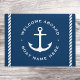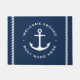 Tapis de porte avec ancre nautique blanche et texte personnalisable "bienvenue à bord" et votre nom de bateau flanqué de bordures de corde. Design blanc sur arrière - plan bleu foncé.
