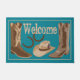 Décorez avec style rodéo occidental avec ce tapis porte avec les mots Bienvenue. Le design est composé de bottes de cowboy brun et brun et d'un casquette occidental avec fer à cheval sur un arrière - plan bleu turquoise turquoise. Ce design est l'art original de Phyllis Dobbs et est disponible avec d'autres arrière - plans de couleurs et sur la coordination des produits pour un thème occidental coordonné.