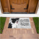 Bienvenue à la Maison "Votre Nom de Famille", ou changez-vous dans le chalet. Un tapis de bienvenue à thème pour chien pour la famille qui aime son chien dans le cadre de sa famille. Le design comporte un magnifique chien de Border Collie. Personnalisez votre nom de famille. "Attention aux humains"