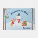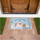 Ce tapis de porte fantaisiste présente une scène d'hiver en plein air. Il y a un bonhomme de neige entouré d'amis dont un renard, un écureuil et un hibou.
