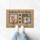 Bienvenue aux invités avec ce drôle de tapis de portes ! "Bienvenue à notre Maison." Personnalisez avec vos animaux de compagnie photos et noms. Parfait pour accueillir les visiteurs dans votre maison.
