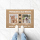 Bienvenue aux invités avec ce drôle de tapis de portes ! "Bienvenue à notre Maison." Personnalisez avec vos animaux de compagnie photos et noms. Parfait pour accueillir les visiteurs dans votre maison.