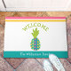 "Bienvenue". Apportez un peu d'hospitalité tropicale dans votre maison avec ce tapis de portes chic et moderne. Une bande d'ananas moderne, graphique, turquoise, turquoise bleu, vert, rose et orange, rose et orange, une typographie manuscrite vert printemps, ainsi que votre nom de famille/message sur une bande bleue turquoise, recouvrent un arrière - plan blanc. Ajoute une ambiance festive et amusante à votre porte d'entrée ! Il vous suffit de taper vos informations avec le modèle facile à utiliser, et vous pouvez facilement personnaliser ce tapis de bienvenue. S'il vous plaît, envoyez-moi un message avec toute question ou demande.