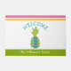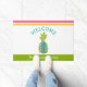 "Bienvenue". Apportez un peu d'hospitalité tropicale dans votre maison avec ce tapis de portes chic et moderne. Un arrière - plan blanc est recouvert d'une bande moderne, graphique, turquoise, bleu turquoise, vert, rose et orange, de bandes rose et orange, de typographie manuscrite bleu turquoise, ainsi que de votre nom de famille/message sur une bande verte printanière. Ajoute une ambiance festive et amusante à votre porte d'entrée ! Il vous suffit de taper vos informations avec le modèle facile à utiliser, et vous pouvez facilement personnaliser ce tapis de bienvenue. S'il vous plaît, envoyez-moi un message avec toute question ou demande.
