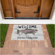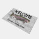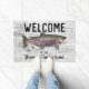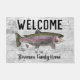 Bienvenue à la Maison "Votre Nom de Famille", ou changez en chalet. Un tapis d'accueil à thème pêche pour la famille qui aime pêcher. Le design comprend une truite arc-en-ciel et un arrière - plan rustique.