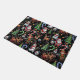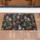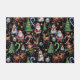 Christmas-themed pattern featuring Santa Claus, reindeer, snowmen, elves, Christmas trees, candy canes, and snowflakes on a black background