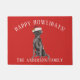 Paillasson de Noël adorable avec un Black Lab Dog portant un chapeau santa sur un arrière - plan rouge festif.