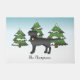 Illustration originale de Destei d'un chien de race Labrador Retriever en robe noire mignonne. Le chien est placé dans une scène hivernale avec trois sapins verts et la chute de neige. L'arrière - plan est un dégradé bleu à blanc qui donne un aspect froid d'hiver. Il y a aussi une zone de texte personnalisable pour un nom.