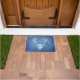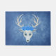 Ce tapis de porte d'accueil extérieur est un mélange brumeux de bleus avec une tête de cerf blanc mythique avec de gros bois et portant trois beaux roses bleus.