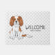 Dessin original de Destei illustrant une jolie couleur blenheim Cavalier King Charles Spaniel chien de race assis. Il y a aussi le texte qui dit maintenant "Bienvenue" avec une zone de texte personnalisable pour un nom de famille ou un autre texte personnalisé. L'arrière - plan a un motif d'empreintes de pattes gris.