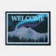 Les aurores boréales violettes et bleues brillent au-dessus des montagnes enneigées par une nuit froide dans l'extrême nord. La lecture de texte, "BIENVENUE" apparaît également en bleu et blanc brillant.
